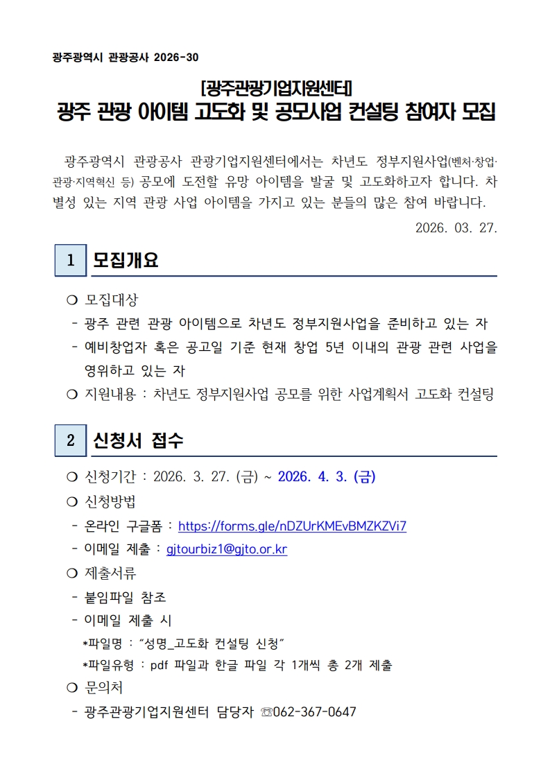 광주 관광 아이템 고도화 및 공모사업 컨설팅 참여자 모집